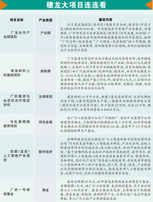 同年5月,國度成長改造委印發《反動老區重點城市對口一起配合任務計劃》,明白廣州與龍巖樹立對口一起配合關系,將穗龍一起配合上升為國度計謀。兩市聚焦“中心請求、龍巖所需、廣州所能”,初步斷定了10個重點一起配合範疇。