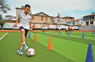 在廣州市對口一起配包養甜心網合的上杭縣城東小學,孩子們奔馳在綠茵場上。